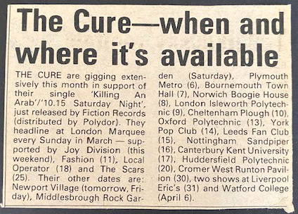 I was at this gig and remember them playing "Killing an Arab" and also playing "10:15 on a Saturday night" a couple of times as an encore.