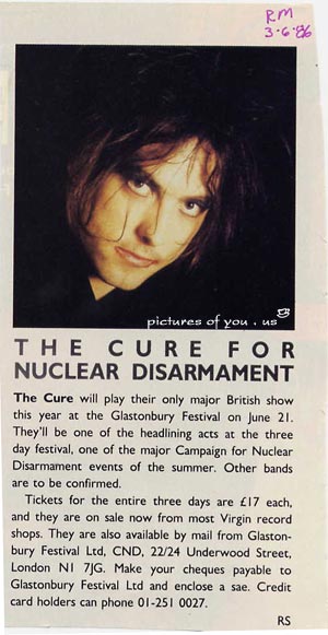 Think the best answer for you is that the Glastonbury Festival is held at Worthy Farm, Pilton, Shepton Mallet, Somerset. I believe the Cure played the main stage, which is called the Pyramid Stage. If this is not enough, please get back to me. In peace, Infoman