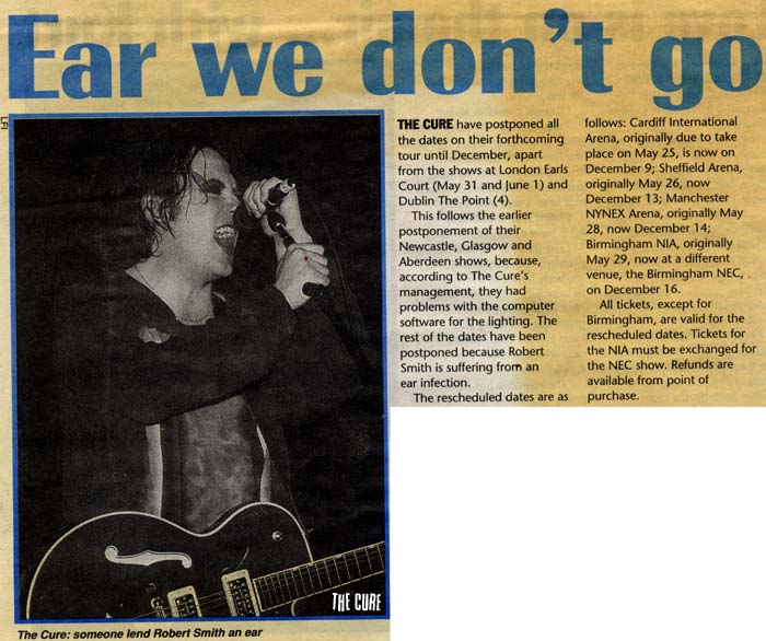 Robert Smith, since returning from New York on May 13th, has been suffering from a pernicious and lingering sinus infection affecting his ears, eyes and throat. As a consequence the shows in Cardiff this Saturday (25th May), Sheffield (Sunday 26th May), Manchester (Tuesday May 28th) and Birmingham (Wednesday 29th May), have been postponed until December: