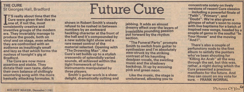 From 25 November to 3 December, the band played Britain, climaxing at Hammersmith Palais.Robert: "The support acts on that tour were And Also The Trees and 1313 who were Lydia Lunch and Steve Severin. They used to come to our hotels to avoid their bed and breakfasts and Severin used to sleep on my floor. We used to talk a lot - getting to know each other better and better. I didn't like what he was doing with Lydia though - it was atrocious."