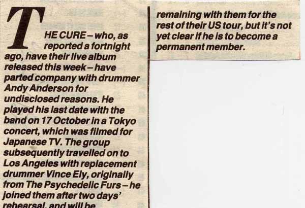 On 30 September, The Cure set off on a tour of New Zealand, Australia, Japan, Canada and America. The gigs went well at first but, again, there was trouble with Andy.Robert: "He was drinking too much. In Sydney, on 12th October, I had a big stand up row with him in a club which turned into a real ruck. It was just one of those arguments that takes place in clubs at two in the morning - y'know, 'You don't give me enough space man' nonsense. I never really understood it, but I was constantly having to reassure him which I eventually got really fed up with."