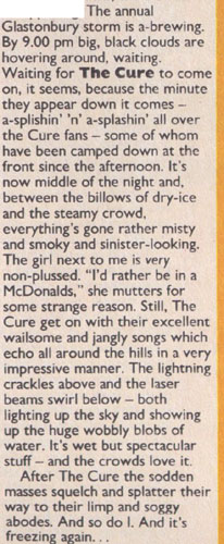 Think the best answer for you is that the Glastonbury Festival is held at Worthy Farm, Pilton, Shepton Mallet, Somerset. I believe the Cure played the main stage, which is called the Pyramid Stage. If this is not enough, please get back to me. In peace, Infoman