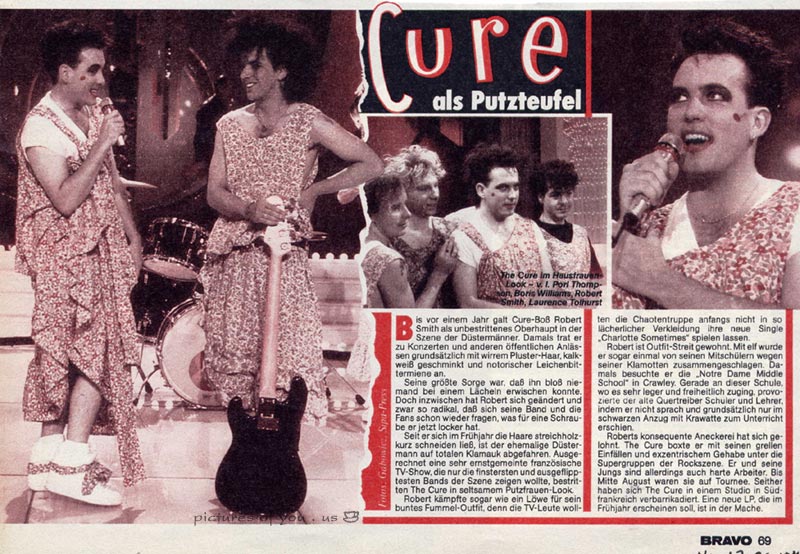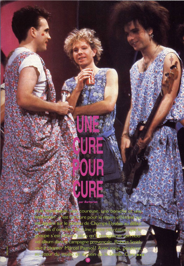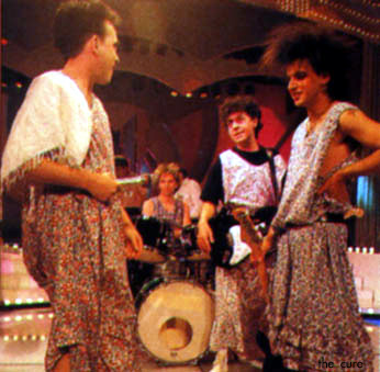 While recording, The Cure took time out to appear on French television, miming to 'Boys Don't Cry' and creating a stir by appearing in frocks and make-up.Robert: "I've never tried to capitalise on an image. At the French concerts, an inordinate amount of people arrived dressed in black despite the fact that the group never likes wearing black, it's just a myth that's arisen. It's equally as difficult trying to escape the quirky corner. That's why I cut off my hair when we went to America, because I wanted the group to be far more sullen and aggressive than people were expecting. I wanted to look stark and it was a crucial calculation because, once I see adjectives like 'cuddly' appearing about me, I think 'This is going to fuck whatever we try to do next'. I mean, if a magazine says 'Wouldn't you like to take him home?', it destroys me when I'm next in the studio wanting to sing something that means something."